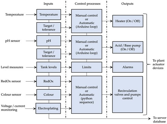 A general block diagram about the software logic is depicted in Figure 9. Only one of the different sensor types is present for simplicity. The main control software can get control inputs either from the app or the touch screen on the plant achieving a very flexible control datapath. In any case, the changes in control signals are transmitted to the rest of the system and enable or disable automatic control loops in the Arduino code or in the Python code. Manual control of the actuators is also possible and also a mix between automatic (such as keeping temperature or pH to a constant value) and manual control of the rest of the plant. At a given frequency, all sensing and status values are saved to the server database enabling the user to obtain historical data. Several critical sensing parameters (the ones with limits) are shared between different control blocks in order to avoid malfunction of the plant. The RedOx and color sensors are fundamental to obtain the status of the biological and electroplating processes and thus used to control the transition of the process from one phase to another.
