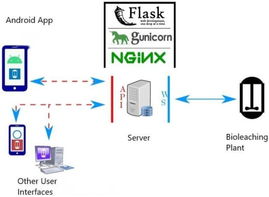 The server functions as an intermediary between users of the Biometallum App and the bioleaching plant, handling the storage of plant information and processing administrator requests. By utilizing Flask (version 1.1.2), Gunicorn (version 20.0.4), and Nginx (version 1.18.0) in conjunction with Telegram (version 10.2.3) integration and web-based APIs on the server, we have developed a robust solution for constructing a user-friendly interface that enables real-time control and monitoring of the IIoT devices within the bioleaching plant via the popular Telegram messaging platform. Figure 10 depicts the system’s key components, with APIs on the left, the server in the center, and the bioleaching plant on the right.