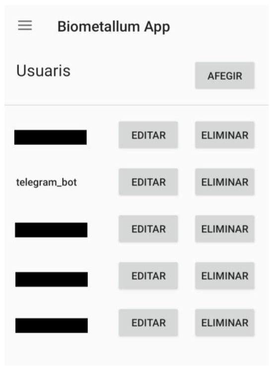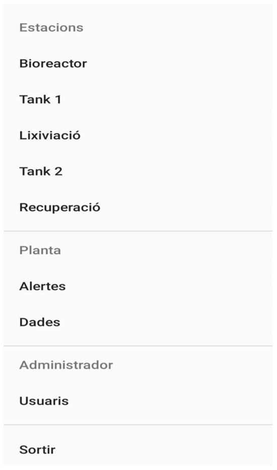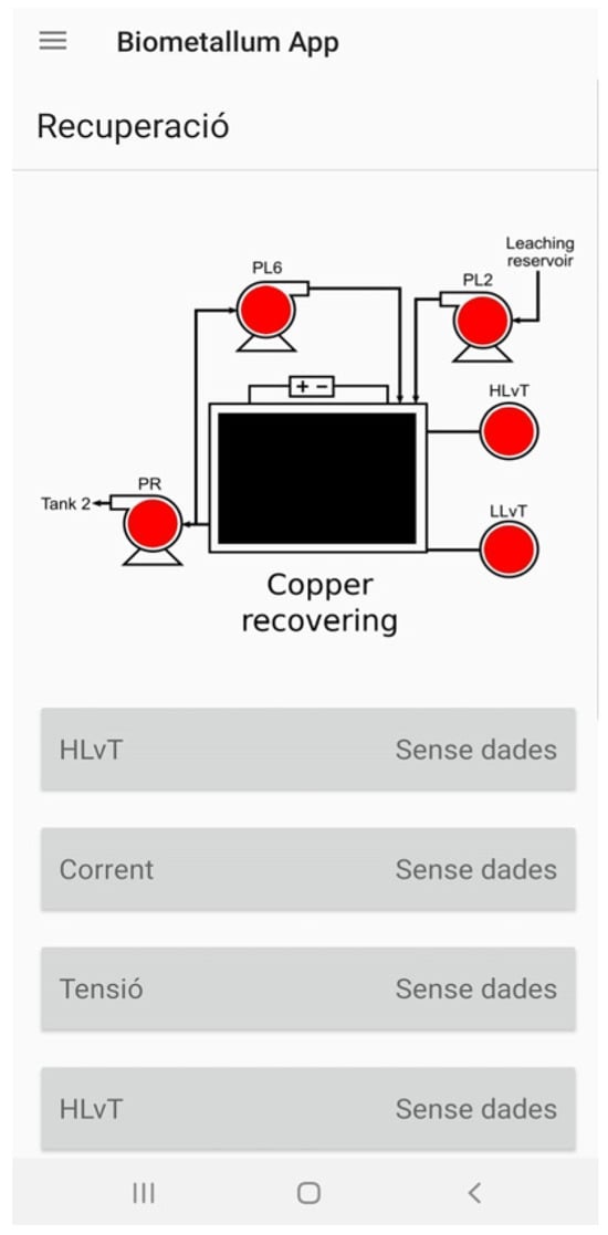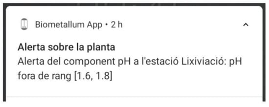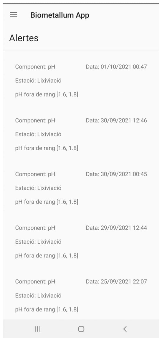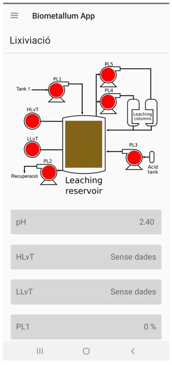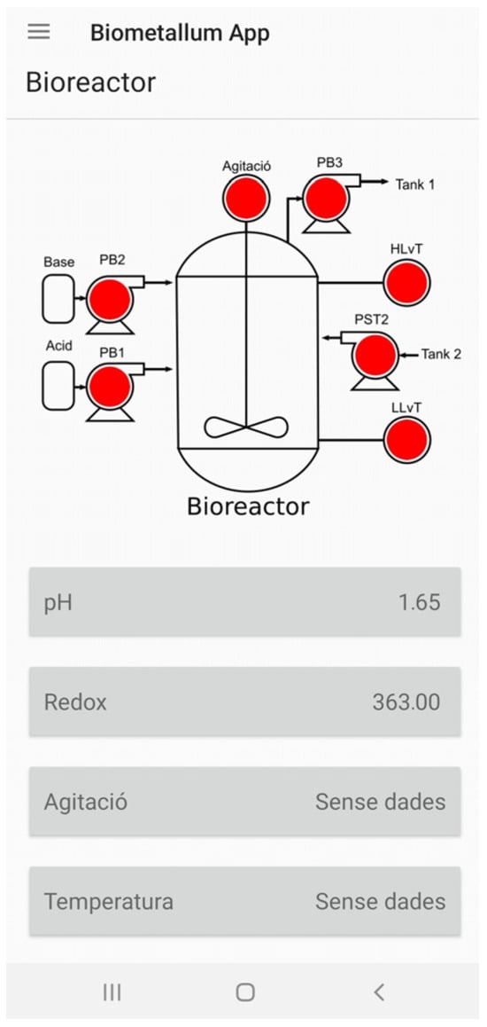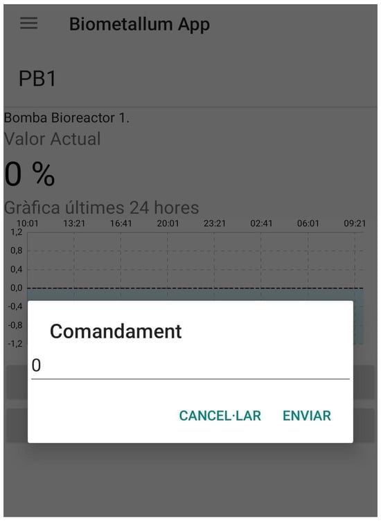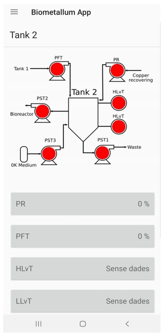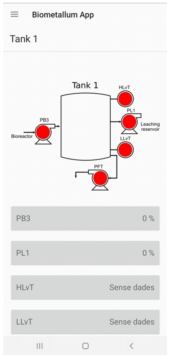 During the development phase, 15 users maintained concurrent connections. Over the weekend, two incidents arose within the bioleaching process, prompting swift intervention by the developed software to prevent failure and restore the process to its optimal state. These incidents highlighted the application’s capability to promptly issue alerts and mitigate potential damage. In one of these incidents, a pH anomaly was detected due to the depletion of acid in dosing pump PB1 within the bioreactor (refer to Figure 2 and Figure 13). This resulted in the pH exceeding the critical threshold necessary for biological growth in the bioreactor. Without the timely issuance of appropriate alerts, irreversible consequences would have occurred by Monday, as a pH level above 2 leads to biomass inactivity with no chance of recovery. Consequently, the prompt alert issued by the system (via the application and via the Telegram) preserved the plant’s operation, extending its functionality for several additional days, allowing the operator to rectify the dosing deficiency and ensuring the continuous activity of the bioleaching process. Furthermore, the system allows for remote command operations of the pumps, with the option to deactivate (0) or activate (1) them, as depicted in Figure 19.