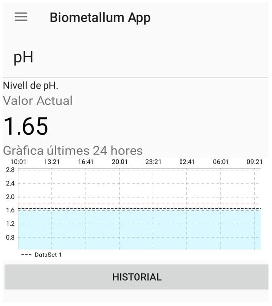 Figure 19 provides in-depth insights into the selected component. It caters to translation requirements and employs the MPAndroidChart library for displaying a dynamic linear chart of the last 24 h’ data. The chart adjusts to the component type, ensuring real-time updates through LiveData objects. In this instance, we can observe that the pH level of the Leaching Station falls within the appropriate range of 1.6 and 1.8.