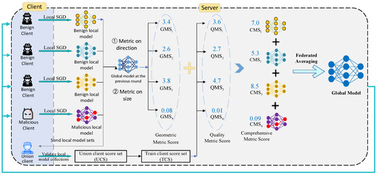 The similarity based on Euclidean distance can identify the difference in malicious models and then assign geometric metric scores (GMSs) to different clients. Also, considering that certain advanced poisoning attacks can geometrically make malicious updates similar to benign ones, we perform quality metrics on all uploaded local models from this perspective. Specifically, we randomly select some of the clients that do not participate in this round of federated learning as union clients. They verify the models uploaded by all local clients separately using their own local data, evaluate the models for different clients based on the trimmed mean, and then evaluate the model quality for all uploaded models as a way to assign quality metric scores (QMSs) to different clients. Finally, the global model is updated by taking a weighted average of the combined quality and geometric metric scores.