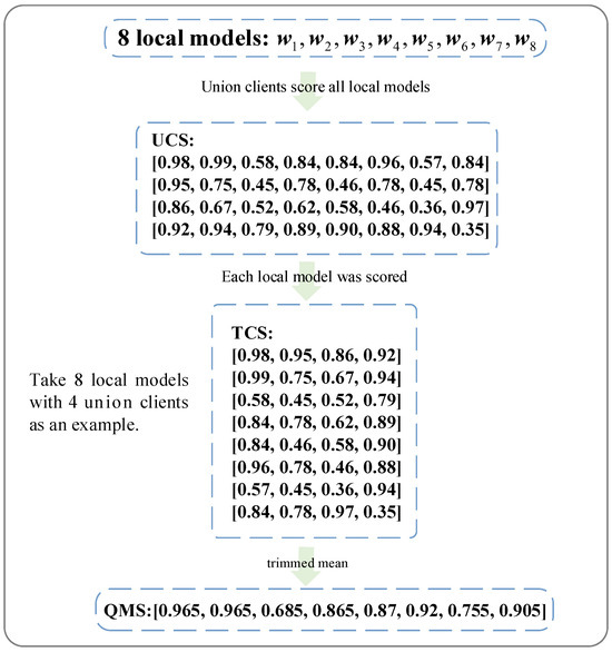 Quality Metric Score (QMS). Here, we consider that an attacker can exploit more advanced attacks such that the model uploaded by the malicious client has the same geometric direction and size as the benign client’s updated model to affect the global model. Thus, defending from a geometric perspective alone is not enough. Therefore, we consider a quality metric for the uploaded local model so as to remove the effect of this kind of malicious client on the global model. Existing defense methods typically maintain a small, clean dataset on the server for quality assessment. The datasets under this approach are usually particularly small and not yet fully representative of the entire data distribution, while also violating the highly problematic principle that federated learning does not collect data. Therefore, we consider delegating server privileges to each client in order to ensure a reliable measure of the quality of the local model, eliminating the influence of the central dataset for distributed quality metrics. Specifically, a certain number of clients are selected to form a union set to participate in the evaluation of the uploaded local models in each round. Then, the generated quality measure score is assigned to the uploaded local models based on the trimmed mean. Figure 3 shows an example of how to calculate the quality metric score. The approximate process is that there are a total of eight training clients and four union clients. After each training client uploads the model weight, the server will send the weights to the union clients, and each union client will use its own local dataset to score the model weights for all the training clients. Then, the server will obtain the final score by trimming the mean for each model weight after collecting all the scores.