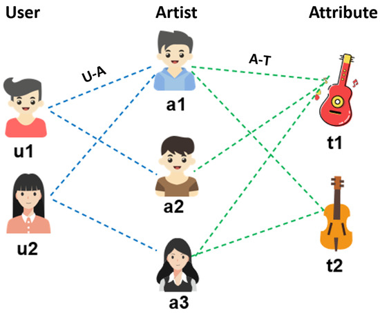 Example of heterogeneous information network that contains three types of nodes (user, artist, attribute) and two types of relations, user–artist (U–A) and artist–attribute (A–T).