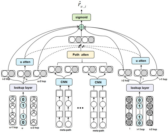 The meta-path attention weight can be interpreted as the contribution of the meta-path to the interaction between u and i. After obtaining the attention value of the meta-path, the enhanced meta-path-based context is calculated according to the following weighted summation:
