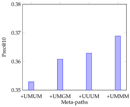 To analyze the effect of different meta-paths on the recommendation performance, meta-paths are gradually added to the proposed model. From Figure 4, it can be observed that the overall performance of the model gradually improves with the addition of meta-paths. Also, different meta-paths have different weights on the recommendation performance improvement: adding UUUM and UMMM is more important for MovieLens.