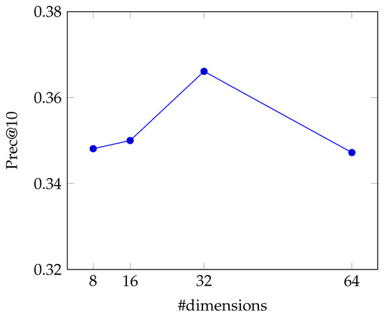 This experiment investigates the output layer dimension size, setting different output layer dimensions of 8, 16, 32, 64, as shown in Figure 6. The performance gradually improves as the output layer dimension grows, reaching the best around dimension 32, and then starts to decline. The reason may be that the model needs a suitable dimension to encode the semantic information, and larger dimensions may introduce additional redundancy.