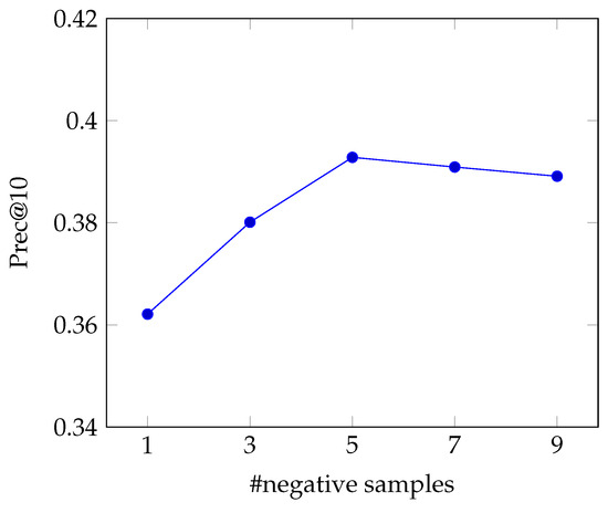The effect of the number of negative samples on the model performance was investigated by varying the number of negative samples in the set of 1, 3, 5, 7, 9. As shown in Figure 7, the model achieves the optimal performance when the number of negative samples is five. The experiment proves that the number of negative samples should not be set too large or too small because it may lead to overfitting and underfitting.