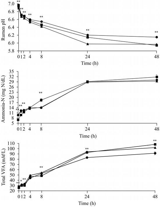 Effects of cultivation stages on rumen pH, and concentrations of ammonia-N and total VFA of sprouted barley incubated in rumen buffer for 48 h. Sprouted barley was cultivated at 0 (■), 4 (▲), and 8 (●) days, respectively. Based on polynomial contrast analysis, pH and concentrations of ammonia-N and total VFA had linear pattern (p < 0.001) by the incubation hour. Value differ between groups within same hour * p < 0.05 and ** p < 0.001.