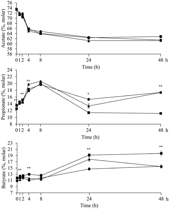 Effects of cultivation stages on concentrations of acetate, propionate, and butyrate of sprouted barley incubated in rumen buffer for 48 h. Sprouted barley was cultivated at 0 (■), 4 (▲), and 8 (●) days, respectively. Based on polynomial contrast analysis, concentrations of acetate and butyrate had linear pattern (p < 0.001) by the incubation hour, while the propionate concentration had cubic pattern (p < 0.001). Values differ between groups within same hour * p < 0.05 and ** p < 0.001.