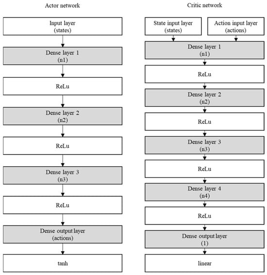 The neural network architecture of actor and critic models considers several hidden layers (Figure 1). The variables in brackets denote the number of neurons for that layer.
