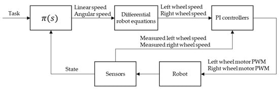 Finally, two independent PI controllers control the commanded velocities by adapting the duty cycles of the electrical motors connected to the driven wheels. Figure 5 shows the final cascade control of the robot’s motion. An external motion planning loop based on deep reinforcement learning techniques generates the requested linear and angular speeds of the robot, depending on the robot’s state measured from the environment. These requested linear and angular speeds are forwarded to an internal control loop based on classical PID controllers. The internal loop measures the linear and angular actual speeds of the robot for closed-loop control.