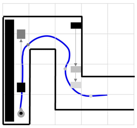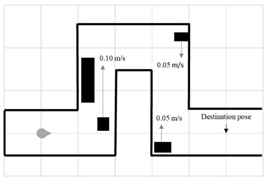 Validation scenario. First dynamic obstacle blocked the way, forcing the robot to follow up the obstacle. Second and third dynamic obstacles were driving at opposite speeds. The robot was forced to perform lane change maneuvers to overtake the obstacles.