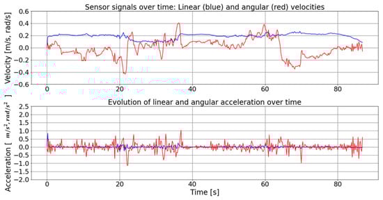 Top graph: linear (blue) and angular (red) velocities of the robot in the learning scenario. Bottom graph: linear (blue) and angular (red) accelerations. The maximum and minimum levels of the linear and angular accelerations were limited to maximize comfort.