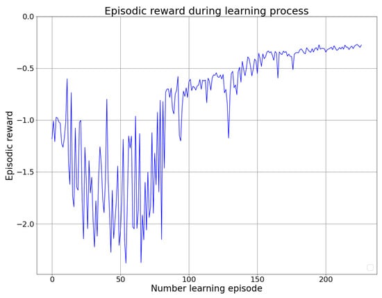 However, since the learning process took a long time, a relax termination condition needed to be defined to find a trade-off between the performance of the resulting policy and the total learning time. In this case, the total learning time went up to 6.1 h. In the case of using of a more powerful system with a server and GPUs, the termination condition could have been adapted to check that the episodic reward does not increase over the learning episodes and ensure in that way a complete learning process.