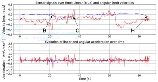 Top graph: linear (blue) and angular (red) velocities of the robot in the validation scenario. Bottom graph: linear (blue) and angular (red) accelerations. The maximum and minimum levels of the linear and angular accelerations were limited to maximize comfort. Between marks B and C is the follow up section, where the robot slowed down its linear speed. Mark H shows the stopping procedure.