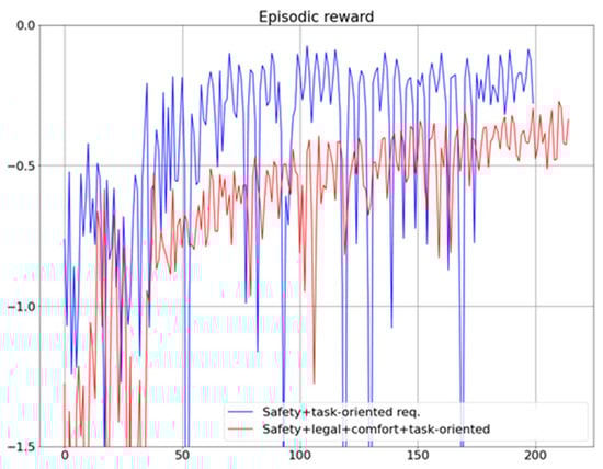 Episodic reward versus learning episodes of the learning scenario for the open-world scenario. The red line represents the case where all requirements (safety, legal, comfort, and task-oriented) were implemented. The agent was still learning after the termination condition was met since the slope of the curve was not flat. On the other hand, the blue line, representing the case where only safety and task-oriented requirements were implemented, was flat after the termination condition was met, ensuring that the agent had completed the learning process.