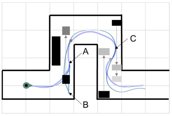 If the robot finds enough free space, the DWA algorithm succeeds in finding the path to the destination, as shown in mark C. The robot found here enough free space to get through the obstacles, despite being surrounded by dynamic obstacles. On the other hand, if the robot gets trapped between static and dynamic obstacles, the robot fails to find a feasible path and collides with obstacles. Mark A shows when the robot collided with the dynamic obstacle. As a consequence of that, the robot moved backwards to mark B. From mark B onwards, the robot moved forward again to reach the destination. The comparison shows how the reinforcement learning algorithm found a way to adapt the robot’s linear velocity to follow up the dynamic obstacle until free space was detected again. This way, a collision was avoided and the total time to destination was reduced, outperforming the results obtained with the DWA algorithm.