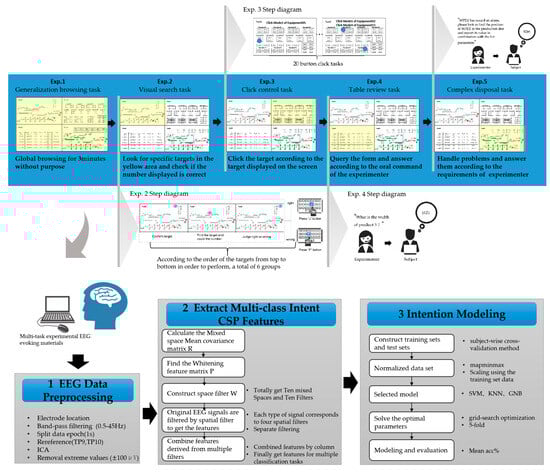 This paper used the multi-attribute task battery (MATB)—a multi-task experimental method proposed by NASA [] as an experimental paradigm. MATB provides a robust method to study the effects of various parameters on a participant’s multitasking behavior, such as his/her decision making, performance level, visual behavior, mental load, etc. Because this experimental paradigm is for military aviation, this paper makes some improvements according to the typical cognitive tasks when humans interact with general complex HCI interfaces, then redesigns the EEG trigger materials under the multi-task paradigm. After inducing intent EEG signals, preprocess the original EEG signal, remove the artifact component, and obtain clean EEG data. The CSP algorithm is adopted for generative intent features and then sent to the machine learning classifiers for multi-type intention discrimination. For the specific algorithm model, see Figure 1.