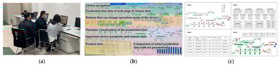 In order to obtain the real operator interaction intent, this paper uses HMI software (BAOTOU STEEL RARE EARTH STEEL PLATE COMPANY 2030 PL-TCM) in industrial control systems as a research subject to extract HCI tasks. An industrial control system is an automatic control system based on computer technology as the core that integrates automation, digitalization, and information network technology []. Among them, HMI software carries out the tasks of real-time visualization of equipment and product data, emergency alarms, controlling machine operation modes, and changing the production parameter model. The research team established the HMI software development and operation, software architecture, basic content and function, and interaction process. On the basis of these field investigations and post-interviews about operator cognitive abilities [], according to HMI software main interface function division as shown in Figure 2 and operator routine interaction behavior, we finally extracted five types of typical HCI tasks: ① Generalized browse task: Daily production monitoring, performing aimless visual browsing behavior. ② Visual search task: Visual positioning of specific targets such as equipment operation state and production data, abnormal target and early warning information, performing purposeful visual browsing behavior. ③ Click control task: click buttons to change the running state of the device and perform click operation behavior. ④ Table inquiry task: Table is a common element in the interface of a complex system. Table review task requires the operator to find specific targets in the table, visually locate and report data, and perform visually locate targets and search reporting behavior. ⑤ Complex dispose task: Complex situation problem disposal, which requires a higher level of cognitive function participation than the above tasks. Experimental procedures are also designed according to these tasks. Figure 2 shows the intention task extraction procedure.