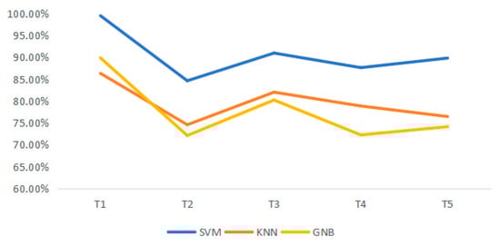 In terms of the recognition accuracy of different interaction intentions, the SVM model has the highest recognition accuracy for each intention task; the average recognition accuracy of the task is 90.5%; the recognition accuracy of task 1 is the highest, reaching 99.48%, followed by the recognition accuracy of task 3 of 90.96%. The recognition accuracy of tasks 5, 4, and 2 is 89.81%, 87.62%, and 84.63%, respectively. The comparison of the recognition accuracy of the three classifiers is shown in Figure 4.