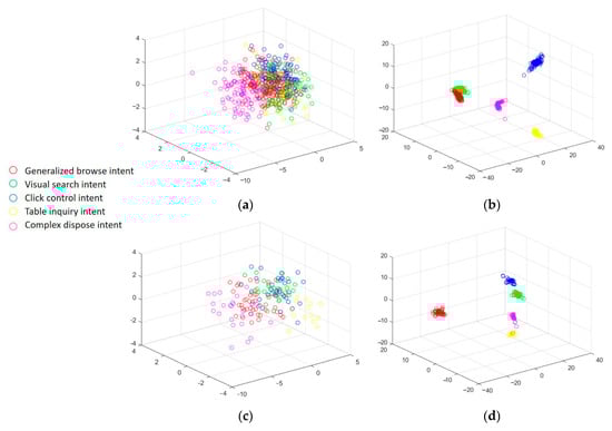 Intention recognition is one of the key technologies to realize natural HCI, and it is very important to improve the accuracy and efficiency of HCI systems. In daily life, humans express explicit intent through facial expressions, voice, and gestures, and in HCI and HRI, intent such as “click” and “copy/paste” can also be easily understood by systems through keyboard, mouse, touch screen, voice commands, etc. However, it is far from enough to understand the real intention of humans only by recognizing the explicit intent. Especially in the intelligent era, intelligent systems emphasize dynamic collaboration between humans and machines. The machine needs to predict the user’s intention and take actions in advance to ensure a smooth interaction. In addition to explicit intent, HCI is filled with a lot of implicit intent []. These intentions are more hidden and more difficult to identify. They are hard to understand through facial expressions and body movements. Some studies have shown that intent recognition combined with user physiological signals such as eye movement [,,] and EEG is more accurate []. However, most of the studies focus on the study of explicit intention at present and only study limited types of interaction intention, such as motor intent (motor imagery, MI) [], cognitive task (mental task) intent [,], visual browsing (visual search) intention [], and click decision intent [].