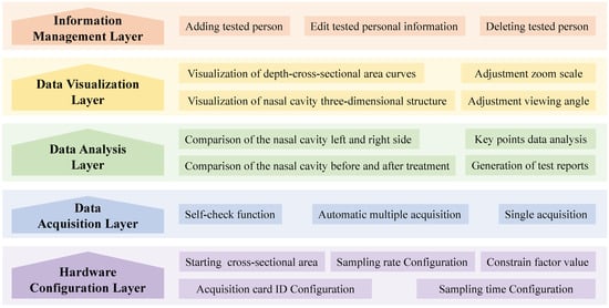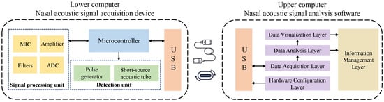 The lower computer of the nasal acoustic signal acquisition device consists of a signal processing unit, a detection unit, a microcontroller, and a USB communication interface. It is used to collect the original acoustic signal in the nasal cavity. The upper computer of the nasal acoustic signal analysis software consists of a hardware configuration layer, a data acquisition layer, a data analysis layer, a data visualization layer, and an information management layer. At the same time, the upper computer of the nasal acoustic signal analysis software acts as the initiator of the acquisition commands and the receiver of the acquired data and is used to analyze and visualize the nasal cavity two-dimensional depth–cross-sectional area curves and the nasal cavity three-dimensional structure reconstruction model.