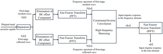 The distance between the microphone, the bottom of the tube, and the object to be measured is shorter in a short-source acoustic tube than in a long-source acoustic tube, making it difficult to separate the incident and reflected waves. The nasal cavity acoustic signal preprocessing flow diagram is shown in Figure 4. Firstly, the incident and reflected waves are separated based on the acoustic propagation characteristics of the short-source acoustic tube. The influence of the DC offset component is then eliminated, and high-frequency noise is reduced by introducing a constraint factor, ultimately resulting in a more accurate input impulse response sequence.