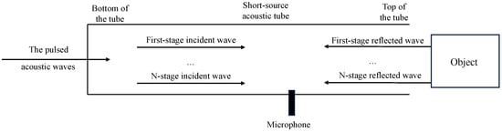 The propagation of acoustic waves in a short-source acoustic tube is shown in Figure 5. Initially, the pulsed acoustic waves are generated by the pulse generator at the bottom of the short-source acoustic tube. It propagates upwards through the tube and continues towards the test object after being captured by the microphone for the first time. Upon the pulsed acoustic waves’ contact with the surface of the test object, an acoustic wave reflection phenomenon occurs, and some reflected waves return to the short-source acoustic tube, being captured for a second time by the microphone. Subsequently, these waves propagate back down the short-source acoustic tube, undergo reflection at the bottom, and serve as secondary pulsed acoustic waves for the second round of detection of the test object. Due to energy consumption during this cyclic process, the intensity of captured pulsed acoustic waves gradually weakens to zero after multiple rounds of repeated detection.
