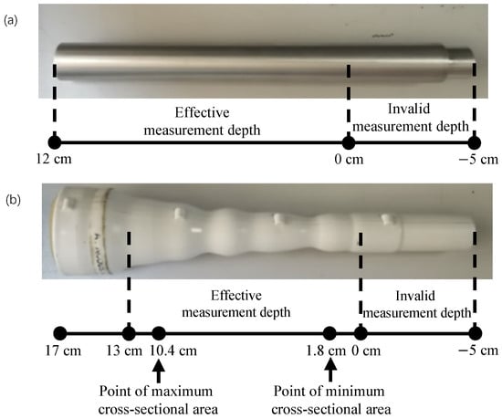 In this experiment, the straight tube model and the simulated nasal cavity model from GM Company in the UK were used as the test objects, respectively. The straight tube model is a metal tube with a constant cross-sectional area and made of 304 stainless steel. This tube is used to assess the average detection precision of the nasal cavity three-dimensional structure reconstruction system. The simulated nasal cavity model is a plastic tube with cross-sectional areas similar to those of a typical human nasal cavity and made of polyvinyl chloride. This tube is used to assess the precision of the system in detecting key points, including the starting point, half-way point, endpoint, minimum area point, and maximum area point. During the actual patient examination, a short glass tube of 5 cm length is inserted into the top of the short-source acoustic tube. This allows the patient’s nostril to fit snugly against the glass tube, preventing acoustic waves from propagating into the air where they cannot be adequately captured by the microphone. Thus, in order to simulate the actual examination effect, the first 5 cm of both models are not considered as effective measurement depths. As shown in Figure 9a, the straight tube model has a length of 17 cm, an effective measurement depth of 12 cm, and a cross-sectional area of 1.23 cm. As shown in Figure 9b, the simulated nasal cavity model is similar to a cone, the length of the simulated nasal cavity model is 22 cm, and the effective measurement depth is 13 cm. A 4 cm thickness of sponge is inserted from 13 cm to the top of the model to absorb the excess pulsed acoustic waves. The cross-sectional area reaches its maximum value of 8 cm at a valid measurement length of 10.4 cm and a minimum value of 0.5 cm at a valid measurement length of 1.8 cm.