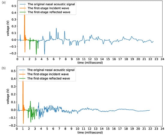 The original nasal acoustic signal in the straight tube model and the simulated nasal cavity model are shown in Figure 10. The horizontal coordinate is the time, and the vertical coordinate is the voltage, which is proportional to the intensity of the acoustic wave. Since the first-stage incident wave has the lowest loss in the short-source acoustic tube and is the earliest pulsed acoustic wave recorded by the microphone. The intensity of the first-stage incident wave should be the maximum. As shown in Figure 10, the maximum peak of the first-stage incident wave is about 0.5 V, both in the straight tube model and the simulated nasal cavity model, and the pulsed acoustic wave oscillates to 0 V gradually with time. As shown in Figure 10, according to the acoustic wave propagation characteristics in a short-source acoustic tube mentioned in Section 3.1.1, it can be seen that the first-stage incident wave is recorded at about 0.8 ms and lasts for 0.8 ms, and the first-stage reflected wave is recorded at about 1.6 ms and lasts for about 1.7 ms.