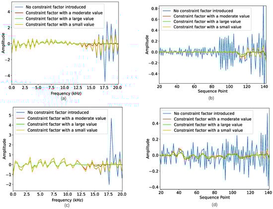 High-frequency noise also affects the input impulse response, which can be eliminated by introducing a constraint factor. Based on the step of eliminating the DC offset component, the time–domain and frequency–domain plots of the input impulse responses from the straight tube model and the simulated nasal cavity model, both before and after the introduction of the constraint factor, are shown in Figure 12.