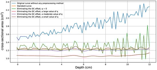From Figure 13 and Figure 14, it can be seen that the existence of the DC offset component causes the error in the cross-sectional area to increase as the depth of the nasal cavity increases. The reason for this is that the nasal cavity three-dimensional structure hierarchical reconstruction method is an iterative method that needs to be solved by using the parameters related to the previous depth layer to solve for the current depth layer. If there is an obvious error in the initial value or at a specific point, the error in the final iteration will progressively increase. Moreover, when the value of the constraint factor q is too small, high-frequency noise is also involved in the iterative operation, resulting in poor smoothness of the two-dimensional depth–cross-sectional area curve in the reconstruction. Conversely, when the value of the constraint factor q is too large, the input impulse response sequence curve is under-fitted, which leads to the two-dimensional depth–cross-sectional area curve being too smooth and the amplitude significantly deviating from that of the standard curves. For instance, the simulated nasal cavity model exhibits sharp bends at both the minimum and maximum cross-sectional area points. These sharp bends result in rapid transitions in the cross-sectional area, making it more susceptible to high-frequency noise and the DC offset component. When the constraint factor q is excessively large, it suppresses too much high-frequency information, resulting in a two-dimensional depth–cross-sectional area curve that is too flat at the bends, failing to reflect the changes at the sharp bends.