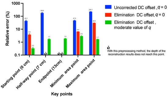 The results of the reconstruction were analyzed in detail using the simulated nasal cavity model, which is more consistent with the actual nasal cavity structure than the straight tube model. Figure 15 shows the relative error of the hierarchical reconstruction results of the simulated nasal cavity model at key measurement points under different preprocessing methods. By eliminating the DC offset component and introducing a moderate value of constraint factor, the method not only extends the effective measurement depth but also improves the reconstruction accuracy of the depth–cross-sectional area. As shown in Figure 15, when the DC offset component is not eliminated or the constraint factor is not introduced, the method is unable to reconstruct the cross-sectional area at a depth of 13 cm because the increased high-frequency noise is not suppressed. With the elimination of the DC offset component and the introduction of a moderate value of the constraint factor, the effective measurement depth of the nasal cavity reconstruction method is extended to 13 cm, and the correction effect is obvious at the starting point (0 cm), half-way point (7 cm), and the endpoint (13 cm). Compared to the uncorrected DC offset component and not introducing the constraint factor method, the accuracy of the cross-sectional area reconstruction at the starting point is improved by 43%, the relative error at the half-way point is reduced to 1.7% and the accuracy is improved by 178.3%, and the endpoint still maintains a low relative error of 1.9%. In consideration of the nasal cavity three-dimensional structure hierarchical reconstruction method is an iterative method. In this experiment, errors caused by the DC offset component and high-frequency noise will both gradually accumulate. This eventually leads to a significant error in the reconstruction results. When the value of the introduced constraint factor is moderate, the cumulative error caused by high-frequency noise will be significantly reduced, thus improving the reconstruction accuracy at deeper distances. In addition, the accuracy of the method at the minimum and maximum cross-sectional area points is improved by 44.1% and 224%, respectively.