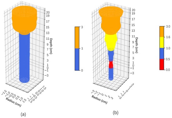 In order to facilitate the observation of the local features of the reconstructed results, the depth–cross-sectional area curves of the straight tube model and the simulated nasal cavity model are visualized in a three-dimensional view with the elimination of the DC offset component and the moderate value of the constraint factor. The results of the three-dimensional structure reconstruction of the two tested models are shown in Figure 16. The three-dimensional structure reconstruction of the nasal cavity is displayed in different colors according to the size of the radius, and the reconstruction results are displayed more intuitively and stereoscopically. This reconstruction can not only provide a basis for further auxiliary diagnoses of the disease but also facilitate doctors in explaining the physiological structures and pathological characteristics to patients.