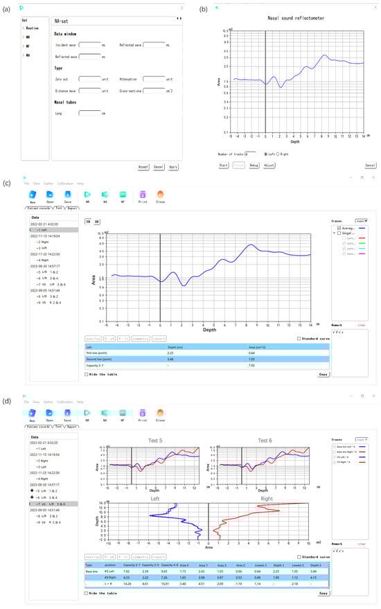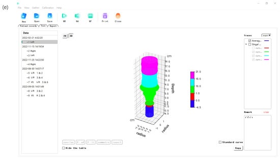 The key functional interface diagram of the upper computer software platform is shown in Figure 17. It shows the lower computer parameter configuration interface, data acquisition interface, single test result analysis interface, multiple left and right nasal cavities test result comparison analysis interface, and nasal cavity three-dimensional structure reconstruction interface in the software, respectively. Shown in Figure 17a is the parameter configuration interface of the lower computer. Parameters such as sampling rate and sampling time can be set to control the collection effect of the lower computer. Shown in Figure 17b is the data acquisition interface. In this interface, the left/right nasal cavity and the number of tests can be selected, and the curve of each test is displayed in real time. Shown in Figure 17c is the single test result analysis interface. The depth–cross-sectional area curve is displayed in detail on this interface, reflecting the variation trend of the cross-sectional area of the nasal cavity at different depths. Moreover, the detailed depth and cross-sectional area values of the first and second narrow points are shown in a table. Shown in Figure 17d is the multiple left and right nasal cavities test result comparison analysis interface. In this interface, according to international medical standards, the red line is used to represent the test curve of the right nasal cavity, and the blue line is used to represent the test curve of the left nasal cavity. It can display the results of multiple tests separately and utilize depth as a standard to concatenate the left and right results curves, highlighting the differences in cross-sectional areas at the same depth between the left and right nasal cavities. Shown in Figure 17e is the nasal cavity three-dimensional structure reconstruction interface. In this interface, different colors are used to distinguish varying cross-sectional areas. At the same time, it also supports real-time adjustment of the viewing angle and zoom scale so that the nasal cavity’s three-dimensional structure can be shown more vividly.