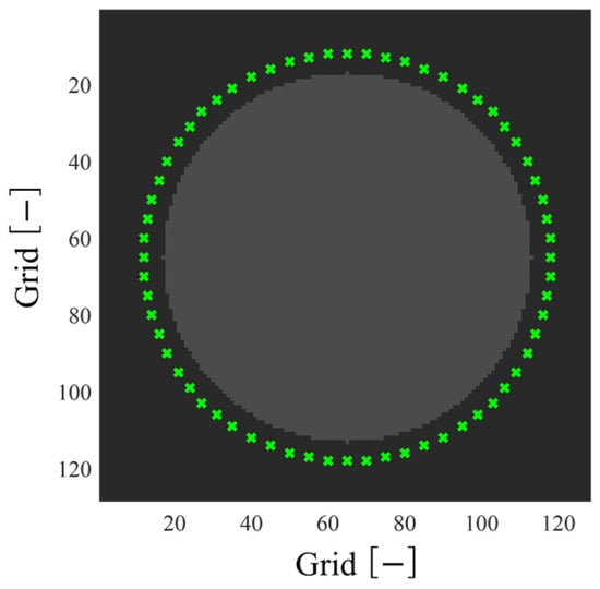 where and is the sound speed at the point . In this study, the terms corresponding to the second-order partial derivatives in the spatial direction of were implemented using fourth-order central difference discretization, and the absorbing boundary conditions were implemented using perfectly matched layers. The pressure field was obtained by LU-decomposition of and inverting it for the system of equations.
