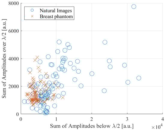 Comparison of spatial frequency distribution. Horizontal axis shows sum of spatial frequency spectrum for spatial wavelength below ultrasound wavelength. Vertical axis shows sum of spatial frequency spectrum for spatial wavelength over ultrasound wavelength. A total of 100 samples were randomly extracted from each dataset.