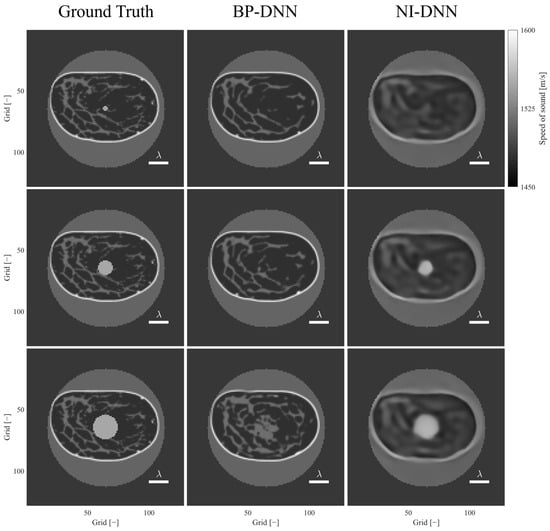 DNNs are required to have the ability to image abnormal structures such as tumours in the breast. To assess the generalization performance against abnormal structures, we produced three different tumour models with different sizes (about 0.2, 0.8, 1.3 wavelength) at a sound speed of 1548 m/s on a breast phantom. A comparison of the reconstructed images is shown in Figure 6. The figure shows that the BP-DNN hardly reconstructs tumours that are not in the training data. For the largest tumour, the BP-DNN seems to attempt to mimic the tumour by concentrating the fibro-glandular tissue.