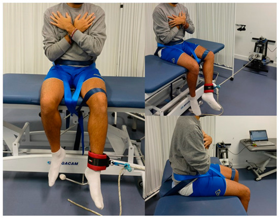 Participants were seated on a hydraulic table, elevated to 75 cm from the floor, with their knees and hips flexed at 90°. They were instructed not to touch the ground with their feet, to cross their hands on their shoulders, and to maintain the pelvis in a neutral position. An ankle brace was applied to the assessed leg and coupled to the flywheel cable with a carabiner. The examiner adjusted the cable length to the amplitude of maximum active range hip rotation. Three belts were used to fix the participants: one belt secured the distal region of the femur of the assessed leg to avoid undesired hip movements, while two belts fixed the anterior superior iliac spines to prevent associated spine movements (Figure 1).