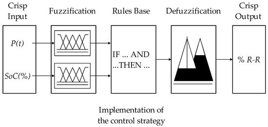 To achieve this objective, we implemented an innovative strategy that enhances the effectiveness of the R-R method through the use of FLC. This FLC function serves as a control system that dynamically adjusts the power change rate limits based on the input energy (PV and WP) and the state of charge (SoC) of the Li-Ion BESS. The output of the FLC provides an adjustable power change rate over time, allowing flexibility when the load is high and resources are limited. Figure 2 presents the overall block diagram of the proposed controller. The algorithm takes as input the measurement of injected active power (PV and WP) and the SoC of the Li-Ion BESS. The proposed method utilizes predefined fuzzy rules to make decisions that directly influence the dynamic ramp-rate (%R-R), adapting it to the real-time power smoothing requirements. Thus, the output variable is conditioned by the actual state of the input variables PT and the SoC of the storage system.