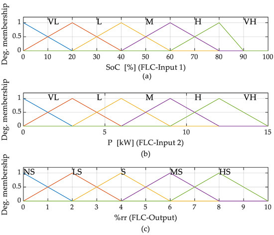 Membership Functions of the Proposed FLC: (a) Input 1: P, (b) Input 2: SoC, and (c) Output: Smoothing Factor (%R-R). NS = No Smoothing, LS = Low Smoothing, S = Smoothing, MS = Moderate Smoothing, HS = High Smoothing. Input 1 Values: VL = Very Low, L = Low, M = Medium, H = High, VH = Very High. Input 2 Values: Very Low = 10%, Low = 30%, Medium = 50%, High = 70%, Very High = 90%.