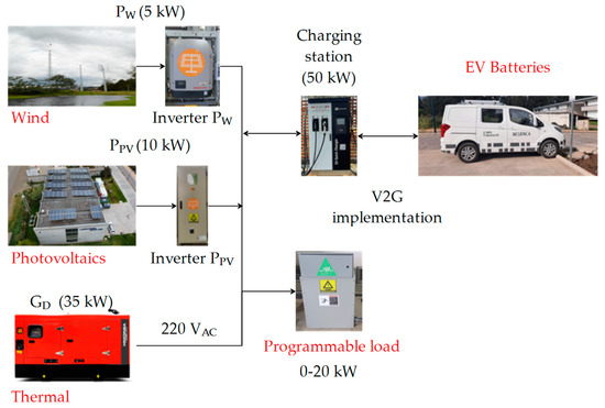 In this study, algorithms developed in MATLAB were implemented to conduct real-time tests on an isolated microgrid. The microgrid consists of polycrystalline solar panels with an installed capacity of 10 kWp , a single 5 kW variable-speed wind turbine, and the Li-Ion BESS with a capacity of 44 kWh. For this specific case study, the Micro-Grid Laboratory at the University of Cuenca (CCTI-B), Ecuador [28], was utilized. The equipment was configured to establish an isolated network, as depicted in Figure 6, which shows the presence of the solar panel array , a wind generator , a thermal diesel generator , a three-phase programmable load , and an EVCS with a BYD electric vehicle, all interconnected with their respective inverters to a network operating at a voltage of 220 . In order to ensure the system’s overall power balance, a constant value of 20 kW was set in the three-phase programmable load. The rationale behind maintaining a constant value over time was to create controlled laboratory conditions where power disturbances were solely attributed to intermittent renewable power (solar and wind) injection. This decision was made to eliminate the risk of the thermal diesel generator receiving a reverse power flow when there is an excess of renewable generation, ensuring safe and reliable implementation of the V2G concept. These controlled conditions not only enhanced the system’s safety but also contributed to a more accurate and reliable assessment of the effectiveness of the proposed V2G method, as the single power disturbance source was carefully controlled.