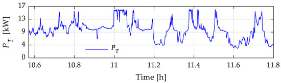 For the laboratory test and validation of the effectiveness of the proposed method, approximately 1.2 h of the total power curve () was emulated (see Figure 9). The choice of this specific segment of the curve for emulation was based on its highly variable behavior, allowing for a more accurate assessment of the proposed method. The goal was to test the method in real-time to obtain a more comprehensive evaluation of the V2G system behavior with the Li-Ion BESS. Notably, the Li-Ion BESS available in the laboratory was used to emulate the power supplied by the PV and WP systems.