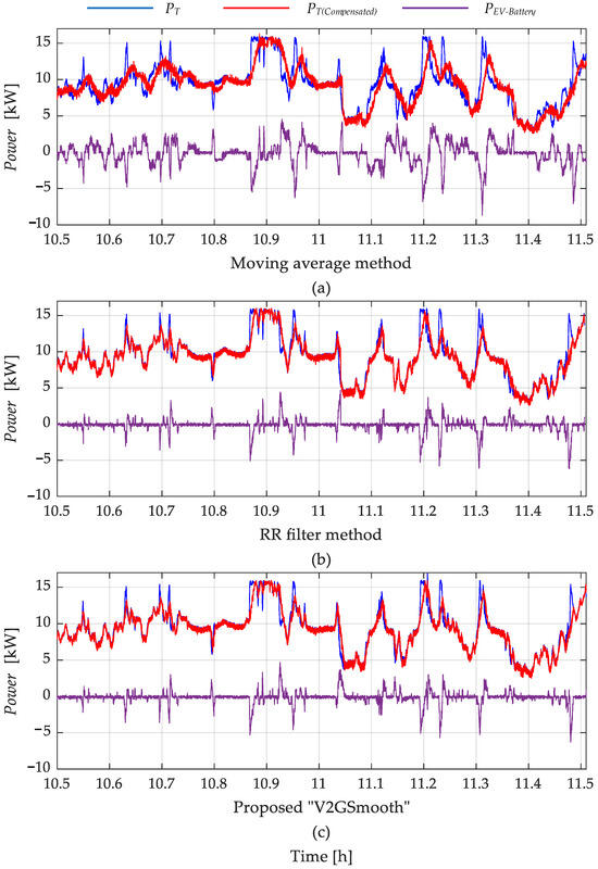 Power response results using V2G with Li-Ion BESS to PV and WP power fluctuations, employing: (a) MA filter, (b) R-R filter, and (c) R-R filter using FLC (proposed V2GSmooth method).