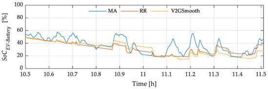 The experimental results are summarized in Figure 10, illustrating the emulated profiles of generated power (blue line), the Li-Ion BESS power (purple line), and the smoothed power output to the grid (red line). In Figure 10a, the smoothing response using the MA method is observed; in Figure 10b, the smoothing response using the R-R method with a fixed ramp-rate is depicted; and in Figure 10c, the smoothing response using the proposed R-R method with a variable ramp-rate through FLC is shown. Figure 11 provides an overview of the Li-Ion BESS’s SoC behavior for each power smoothing methodology in this study. Figure 11 represents the SoC status with MA, R-R, V2GSmooth, demonstrating satisfactory performance as the system maintained its operation within safe values (20–80%). This highlighted the effectiveness of the proposed method in this particular case.