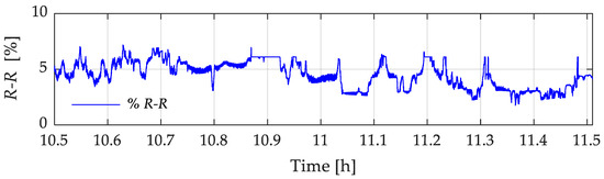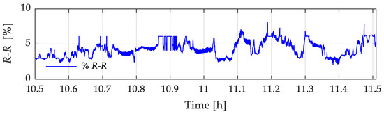 The results indicate that the enhanced R-R filter method through FLC achieved a variance reduction of 14%. Figure 14 illustrates the time evolution of the resultant smoothing factor, expressed as a variable %R-R, at the output of the FLC.