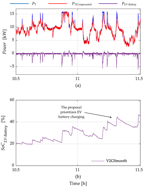 A charging condition was implemented for the Li-Ion BESS to harness all peaks of RES power generated for its charging. In this case, an SoC of 20% was set, and over time, it was observed how the Li-Ion BESS prioritized its charging. The goal was to ensure that the Li-Ion BESS was charged for use in the EV through the V2G system. In Figure 13a, the power smoothing through the R-R filter with FLC can be appreciated, achieving a 10% reduction in variance. In Figure 13b, it is observed how the SoC of the Li-ion battery started charging until it reaches 48%, prioritizing its charging over power smoothing and thus taking advantage of renewable energy peaks.