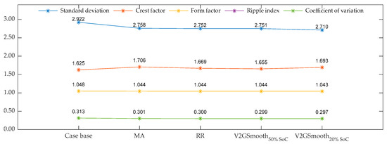 This study evaluated various metrics (see Figure 15) to analyze the performance of different smoothing methods applied to power generation curves in the context of V2G. The considered metrics included standard deviation, crest factor, form factor, ripple index, and coefficient of variation. Each metric was analyzed in different scenarios using various smoothing methods on the original curve within the same time horizon.