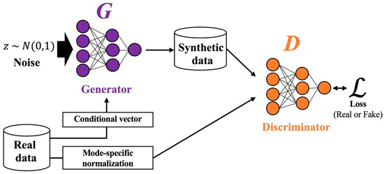 The loss function is represented as . represents the expected loss. D is the discriminator function. G is the generator function. Neural networks implement both functions. z is the noise derived from the standard normal distribution (N(0,1)). represents the synthetic data generated by the generator function. and represent the real and generated data distribution. x represents real data. This modification decreased the mode-dropping phenomenon observed in vanilla GAN [8]. Moreover, CTGAN implements the normalization method with the variational Gaussian mixture model (VGMM) [24] rather than min–max normalization using the Gaussian mixture model (GMM) [24] used in TGAN. Unlike the min–max normalization, VGMM can generate continuous data from normalized complex distributions. This approach is referred to as mode-specific normalization.