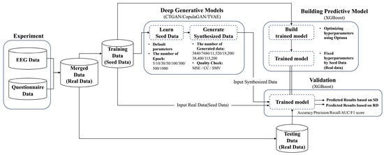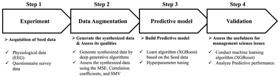 This study was conducted in accordance with the procedure depicted in Figure 3. First, we conducted an experiment to collect the seed data for augmentation. Second, we augmented the seed data using synthesized data generated using deep generative algorithms. Third, we built a predictive model. Because the built model in this phase is derived from the seed data, it could be considered a normative promising model. Accordingly, in the validation block, whether synthesized data become close to real data can be confirmed by comparing predictive results based on both data. Accordingly, in the validation phase, whether synthesized data become close to real data can be confirmed by comparing predictive results based on both data. In the last step, we validated the usefulness of the synthesized data using a machine learning algorithm in terms of predictive performance. The detailed explanations are presented below.